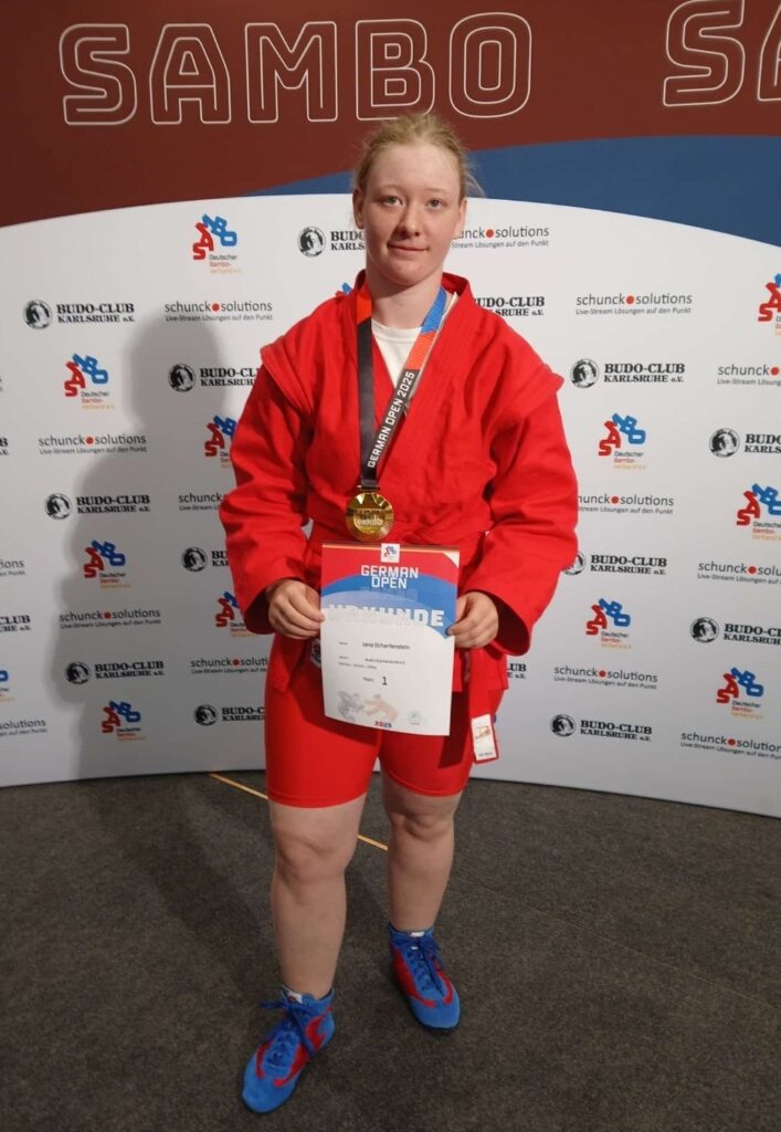 Ebenfalls aktiv war unsere Jana. Anfang diesen Jahres hat sie beschlossen , dass ihr ihre Karriere im Einzelwettkampf sowie in der Bundesligamannschaft der TSV Altenfurt nicht genug ist. So hat sie sich entschieden zusätzlich das dem Judo und Ringen verwandte Sambo „auszuprobieren“. Bei der Teilnahme an den German Open in Karlsruhe hat sich ihr jahrelanges Training und Engagement bestätigt. Sie erkämpfte sich vor Ort gegen eine starke Konkurrenz den Meistertitel.